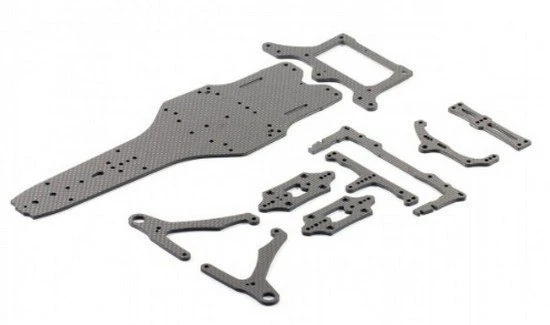 New design graphite main chassis, lower pod plate, rear pod plate, front lower arm, caster adjust plate, center top plate, chassis brace, upper pod plate.
