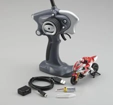 Kyosho captures the fascinating world of the motorbike racing in the palm of your hand with the stunning realism of the new MOTO Racer. MINI-Z quality and engineering guarantee performance that will leave onlookers speechless as the driver appears to control the bike with stability through straight lines and deep banking turns. Incorporating the same theoretical driving control as a real motorcycle, the steering control logic and the driving control system allows the model to be maneuvered freely like no R/C racing bike ever before. Amazing two-wheeled vehicle stability has been achieved with the advanced E-gyro System featuring an in-wheel rotator from a brushless motor built into the rear wheel. Powerful motor drive delivers efficient gyro effect to realize driving stability. Regardless of speed, the E-gyro allows stable straight line running and cornering. In addition, separate RPM settings for low speed and high speed can be made on the E-gyro to favor greater stability or greater maneuverability. For example, the E-gyro’s RPM can be set at high RPM for greater stability for driving at slow speeds, or the RPM can be reduced for easier banking turns at higher speeds. The E-gyro can be set to suit your skill level or however you prefer. This combines with the suspension systems on front and rear to deliver super smooth handling. Also, with the newly designed FHSS 2.4GHz R/C system, up to 40 models can be raced at the same time. The model is fully pre-assembled and the Readyset includes Li-Po battery and charger. Simply add your own batteries to the transmitter and charge the included Li-Po battery to experience the thrill of driving your own racing motorbike.