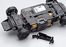 The temptation for Kyosho to recreate the same high performance and style of a true AWD (all-wheel-drive) in Mini-Z size was simply too much to resist. The advanced design combines a shaft driven AWD with a precision 4-wheel independent suspension using a king-pin and strut system in an ultra-compact chassis. The addition of newly designed front and rear differential units using crown and pinion gears produces high efficiency drive performance with similar low levels of resistance to the existing 2WD version. Also, the addition of the AWD drive train hardly increases the weight of the chassis at all, enabling the benefits of AWD to be realized without any downside. The final result is a powerful chassis with awesome handling. The narrow 65mm width of the chassis also matches a wide range of the exquisite car bodies that the Mini-Z is famous for. The design also allows for personalized setting adjustments such as easy toe angle changes with optional parts. This AWD chassis introduces a completely new dimension to the high-tech world of micro racing.