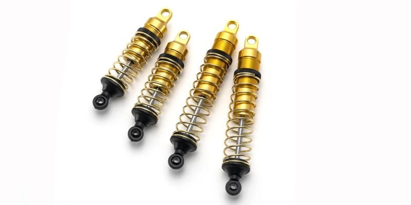 Equipped with gold anodized oil shocks that resemble the pressure shocks that dominated the era. Dial adjustment allows for easy vehicle height tuning for precision chassis setting.