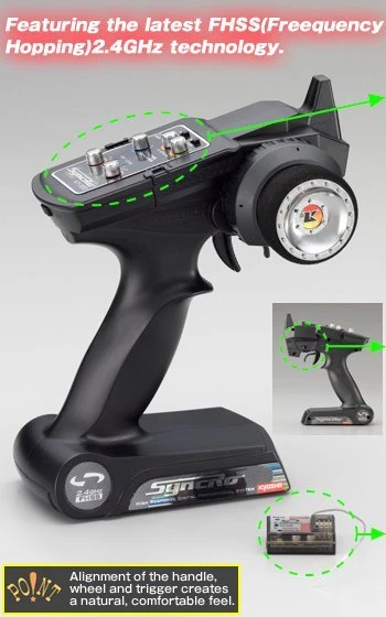 The advanced ergonomic design is very comfortable and delivers superior control. The transmitter is powered with just four AA-size alkaline batteries, which makes the Syncro balanced and lightweight, which virtually eliminates the fatigue common with heavier radios.