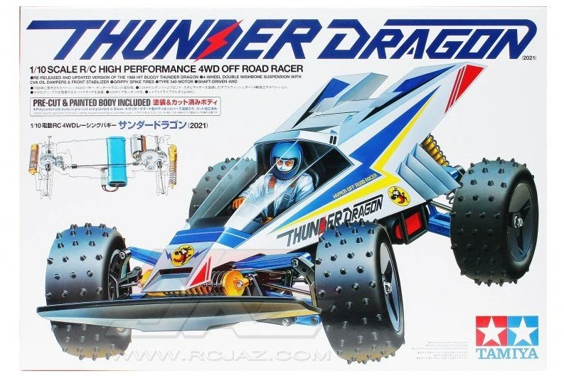 This is a re-issue of the classic Thunder Dragon buggy originally released in 1988. The classic buggy utilizes shaft-driven 4WD and smooth, ground hugging suspension providing a super-fun driving experience. The stylish Thunder Dragon body which appeared in a classic R/C comic in Japan, is an exciting re-release for R/C fans of all ages and abilities.