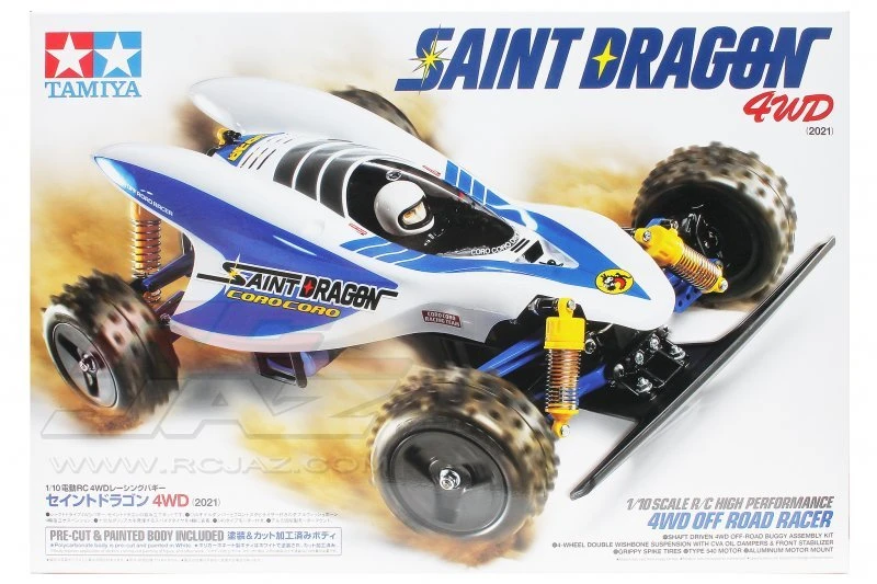 | Tamiya 47459-60A – 1/10 Saint Dragon 4WD (2021) (w/o ESC) This R/C kit recreates a Tamiya popular 1980’s R/C comic car famously known as the Saint Dragon. The limited-edition recreation is mounted on the same chassis as the Fire Dragon, which is a capable 4WD off-road machine! Efficient Shaft-Driven 4WD • R/C assembly kit. Length: 390mm, width: 240mm, height: 135mm. Specification: