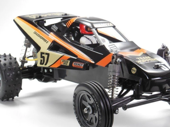 The Grasshopper II is one of Tamiya’s iconic radio control car kits from the late 1980’s. It was an enhanced follow up release to the original Grasshopper kit. The kit features a number of updates while keeping largely faithful to the original model. Its streamlined construction process makes this kit perfect for less experienced users and R/C veterans alike, while separately sold option parts can be used to enhance the model. This Limited-Edition release features a black molded plastic body that only needs stickers to be applied!