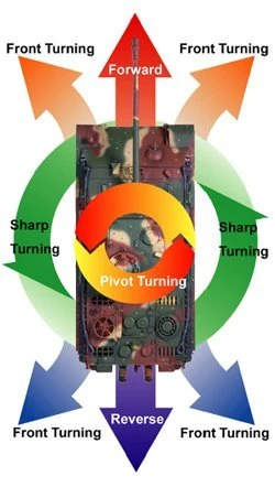 | Running Performance rn Front-mounted pre-assembled gearbox contains two type 380 motors to providern reliable all-terrain mobility. Dual motors can operate together or individually to replicatern realistic tank movement. Metal torsion bars and suspension arms combine withrn wide tracks to realize smooth running and excellent maneuverability. | |