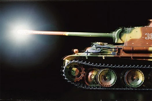 | Visual Effects rn When firing main gun, muzzle flashes, speaker roars and recoil gearbox retracts gun barrel, then slowly returns it to standard position. In addition to this action, the hull itself recoils by means of gearbox movement. Machine gun is also linked with firing sound and LED muzzle flash. | |