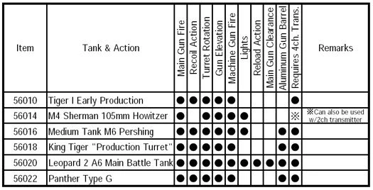 | DMD Control Unit T-03 rn The unit includes two FET speed controllers for operating two running motors. Independent circuits for turret rotation motor and gun elevation motor are also installed. With this unit, R/C tanks can be controlled easily just like an R/C car. rn rn DMD Multi Function Unit MF-01 rn Connect to DMD control unit T-03 to provide many realistic effects such as main/machine gun firing sounds, muzzle flash and recoil movement. rn Reference Materials | |