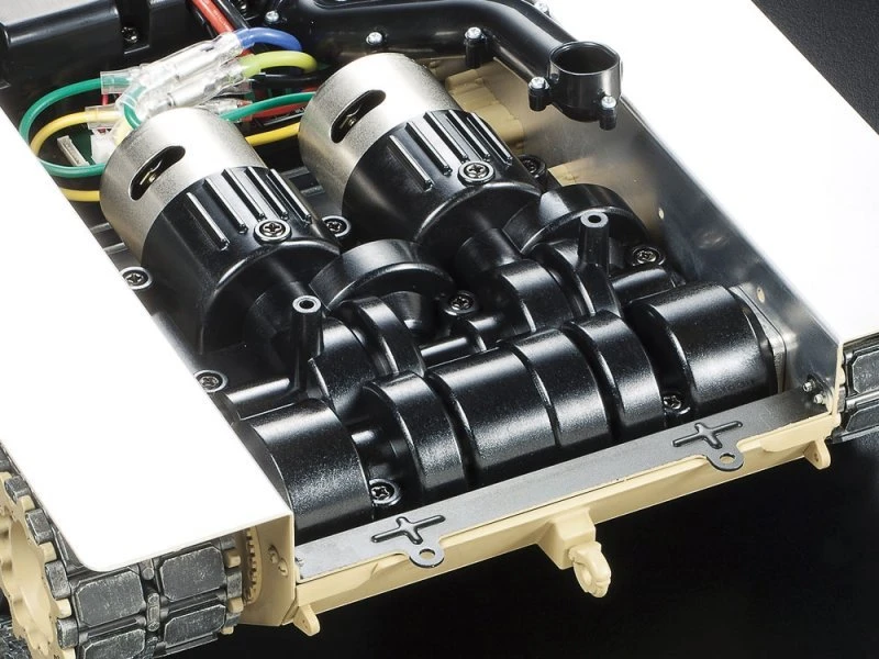 - Gun barrel control system factors in the model movement and elevation changes keep main gun trained in a direction set via the transmitter.