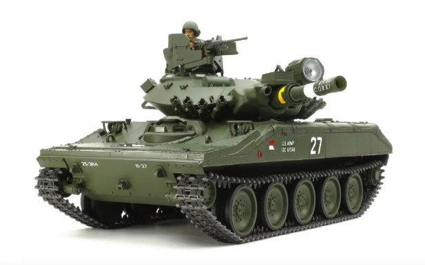 This massive Tamiya R/C replica recreates the shape of the rather unique M551 Sheridan in 1/16 scale. The M551 was designed as airdrop capable armor with wading capabilities, a key concept as the U.S. took on the role of global policeman post-WWII. With an aluminum hull and rolled steel turret, it weighed just 15 tons, but had impressive firepower in the shape of the M81 152mm gun/launcher, which could fire standard rounds and MGM-51 Shillelagh missiles. The M551 was in service with active units from 1968 to 1996 and saw action in the jungles of Vietnam.