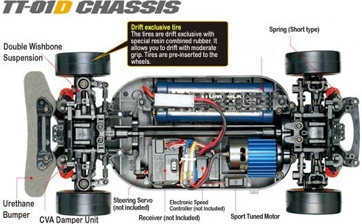 - TT-01D drift-spec modifications include drift tires, adjustable suspension tuning, full ball bearings, sport- tuned motor, aluminum heat sink, CVA mini shock dampers and short springs.