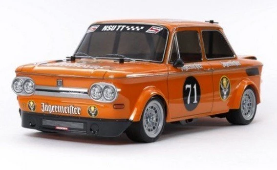 This radio control model recreates the Jägermeister-sponsored edition of the NSU TT, a race-oriented variant of the Prinz, of which almost 2,500 examples were built in the late 1960s and early 1970s by NSU Motorenwerke AG. It was powered by a variety of inline-4 engines depending upon the spec.