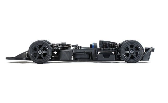 The chassis uses shaft drive 4WD TC-01 with inboard suspension in order to match the low vehicle height. A motor is mounted on the center of a monocoque frame with high rigidity and the propeller shaft transmits power back and forth. Equipped with an oil-filled gear diff. 4-wheel independent double wishbone suspension with long arm specifications. An inboard type that operates a horizontal oil damper vertically with a push rod and rocker arm. By adjusting the amount of spacers, you can set the camber angle, caster angle, and toe angle. In addition, the suspension arms / uprights use common parts on the front, back, left, and right to provide high maintainability.