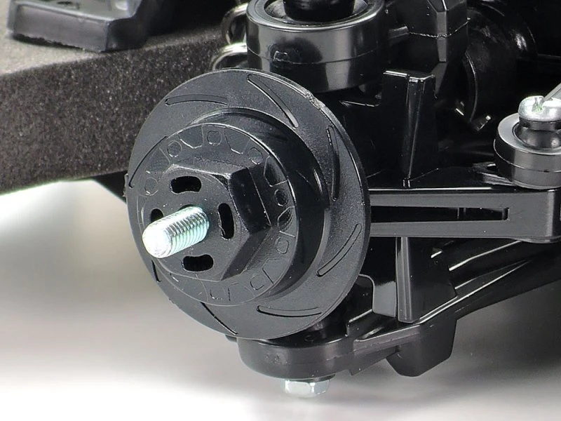 The shaft-driven 4WD TT-02 chassis employs a longitudinal layout with the battery on the left and the motor on the right, to give excellent stability. In addition, it features identical left and right suspension arms and uprights for ease of assembly, plus easy-to-maintain gearboxes. It is a highly adaptable chassis, as it offers 2 different wheelbases, 2 ground clearance settings and 2 tread set-ups in addition to a range of 10 possible gear ratios. It is not short on looks either, with brake disc-shaped wheel hubs and stylish front bumper supports. Gun metal color 10-spoke wheels and slick tires make for a racy finish.