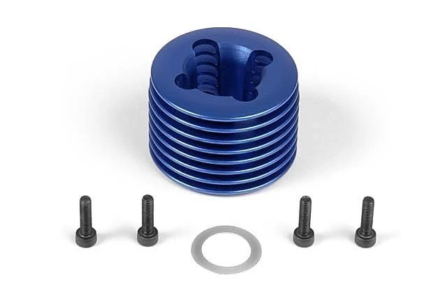 CNC-machined blue-anodized aluminum heatsink head for NT18 engine. Includes head shim and four machine screws.