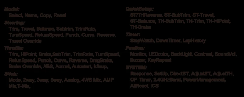 | KIY CONCEPT PAT.P KO PROPO introduces Kustomize It Yourself (K.I.Y.) an interchangeable transmitter. The concept of the new K.I.Y. brings simplicity to customizing and upgrading wi thin a modular system. The new transmit ter is composed of 3 modular units: Steering, Throttle and Master units. The three separate modular units can be eas i l y put together, no s crews required. Just push the safety lock of the joint, pull the lever and pull or push to insert or remove the modular unit. It’s that simple! You can use the K.I.Y. to unlock your next system and bring more enjoyment to your hobby. 2.4GHzFHSS The FHSS system which is used has a foldable and removable antenna for storage. The improved system increases the reliability and removes error for communication failures. The corresponding receiver used is the KR-411FH, which is the same receiver used by our other FHSS systems. High performance CPU & 2.7inch LCD Adopting a new CPU that is 20% faster then our previous system. The 12bit processor inside this master unit allows for quick data processing and securely performing delicate control. The large size LCD allows for various function configurations at a quick glance. Adjutable Trigger Position & 3D Trigger The position of the trigger can be adjusted (forward or back) to your preference in the trigger action. The 3D trigger is also included for even more comfort and infinite customization. Quick SetUp Quick Set Up allows for a shortcut to quickly setup your vehicle. These are the basic configurations that are usually used to setup your vehicle and accessed the most. Direct Button The four buttons under the LCD panel are the Direct Buttons. When one of the buttons are pressed, the assigned function will appear in the menu for quick reference and adjustment. SPECIFICATION No.80500 Repair Policy All EX-1 KIY systems will have a serial number for each region that it is sold in. This will be used to know where the system was purchased. So if you need any service the Tx will have to be sent back to the region from where it was originally purchased. |