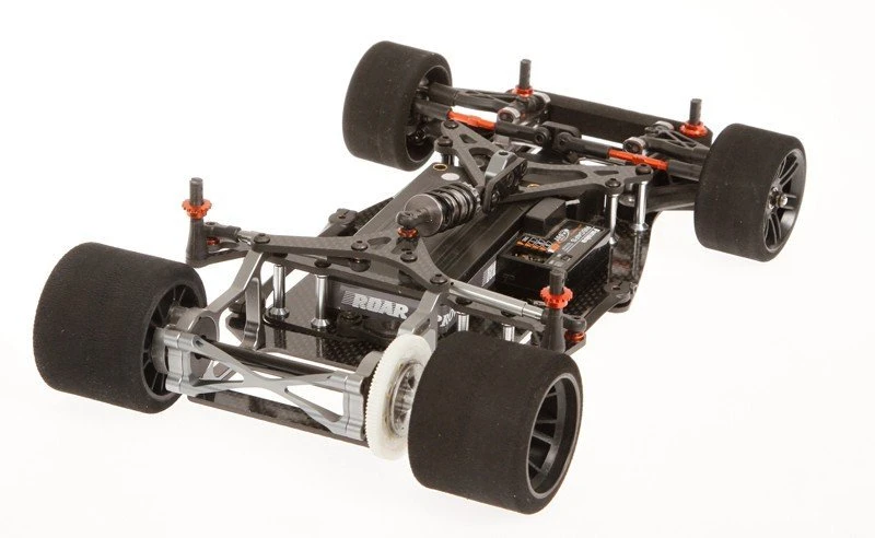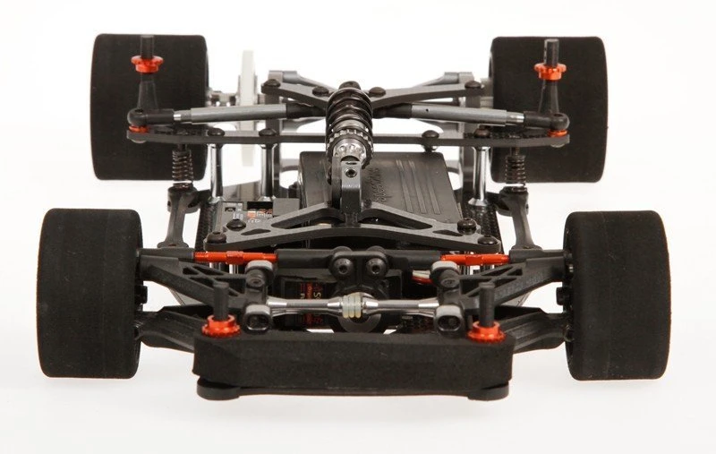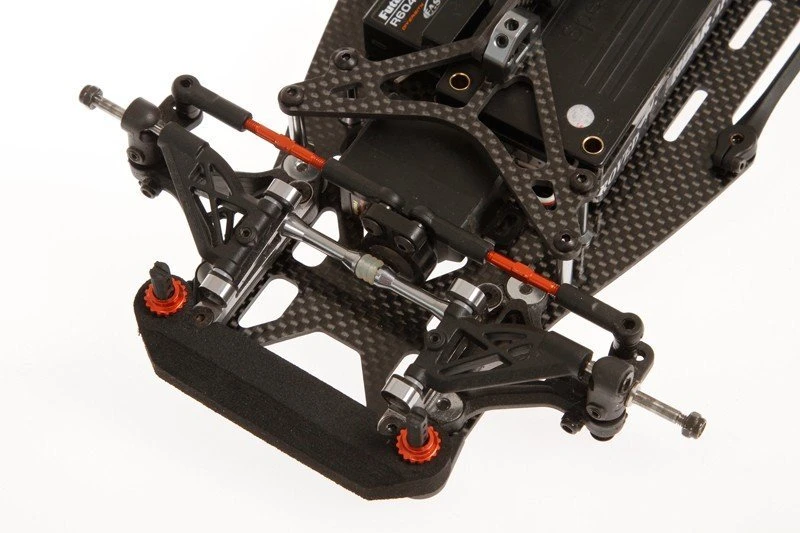 through the use of orange anodised shims, has adjustable Ackerman. The kit includes