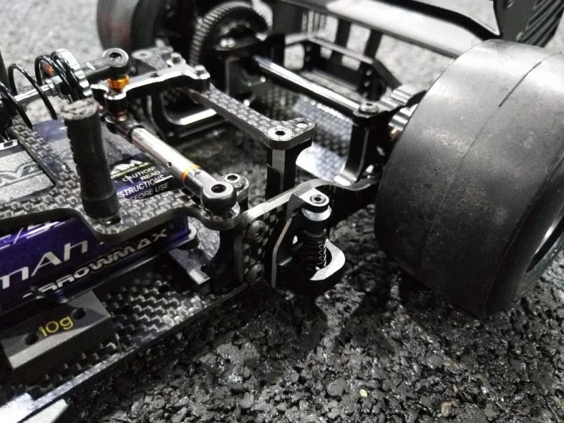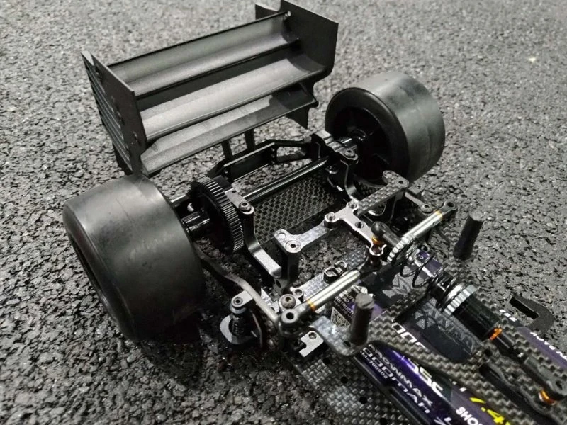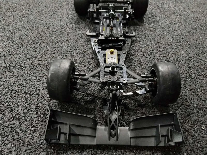 - New wing mount which is independent of the rear pod movement. It is connected to the chassisplate via sideplates that run under the rear shaft and diff. This makes the suspension work much more like a independent suspension car by massively reducing the inertia of the pod. In addition, the angle of attack of the wing is very constant compared to the traditional design. It also allows to run more rear droop without making the car unstable during high speed cornering.