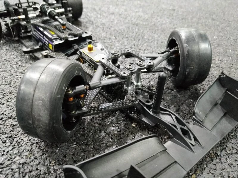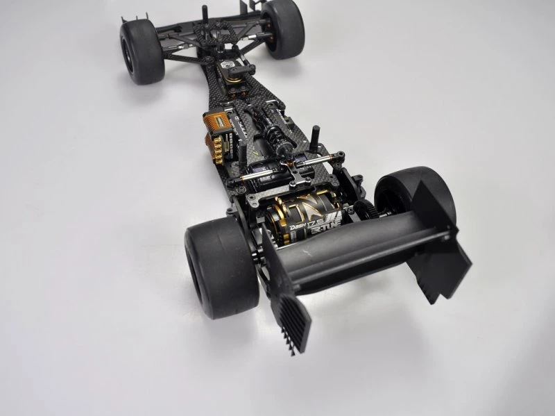 The tubes also work as roll limiter, which reduces the risk of dirt getting into the tubes or oil leaking out from them. - New ultra-low center of gravity rear pod. The angled rear plate gives torsional stiffness, protecting the rear shaft and bearings, while keeping all masses low in the pod. This increases rear grip of the car, and preventing grip roll in high grip conditions. At the same time, body touching with the pod is largely reduced.