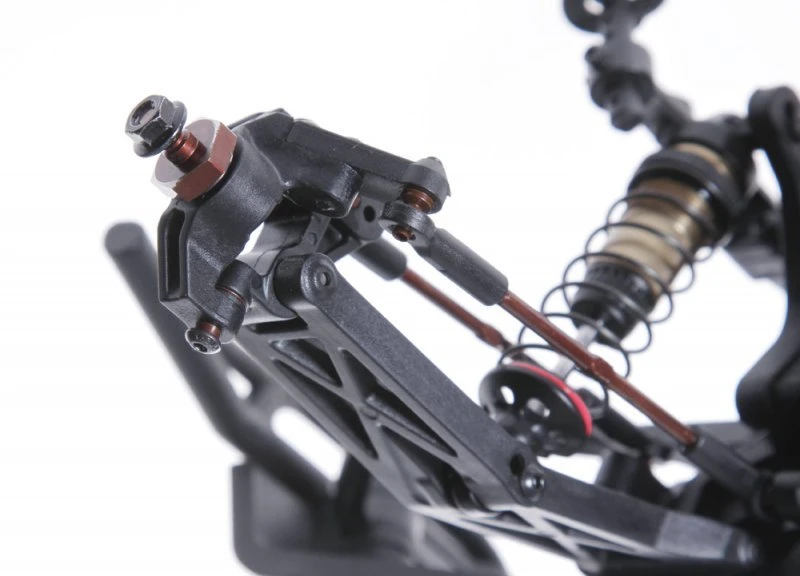 The long front wishbones are made from a super strong composite material. The arms are angled to optimize the CG and pivot on 3mm captured pins on the inside and out. The arms have 2 mounting positions for shock angle and are prepared to use an optional anti-roll bar if needed. Spring steel front and rear track rods are mounted to durable composite captured ball joints. The track Rods have L/R threading for easy adjustments. - Castor blocks Steering Block