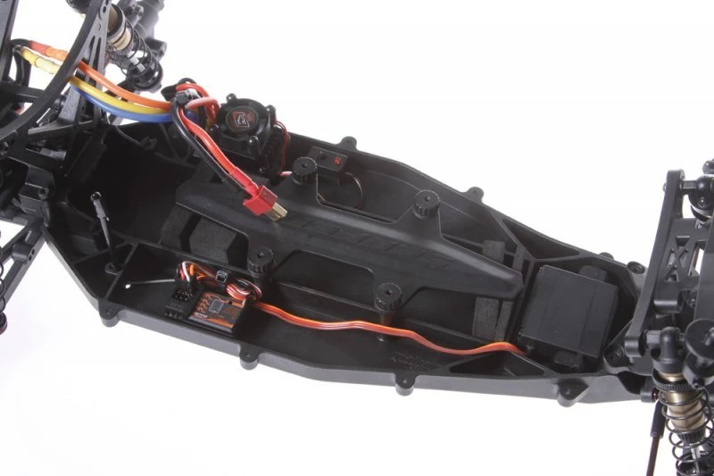 Composite chassis plate with a layout allowing for a perfect weight balance, and optimal space for the electronics, battery and servo. The front kick-up angle in the chassis incorporates more clearance for racing and allow for better nose landings.