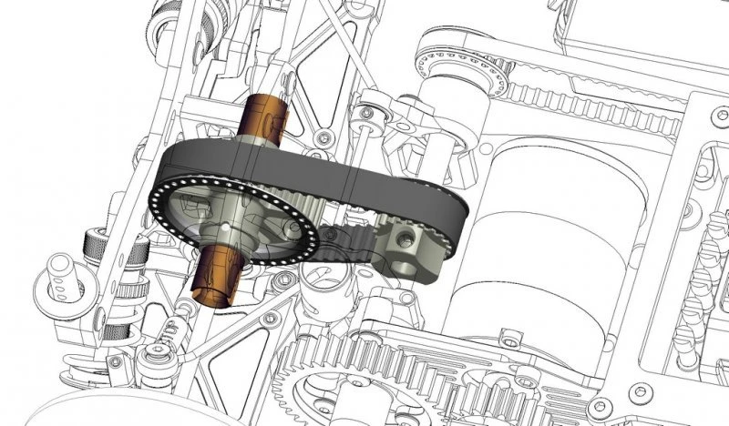 - Further down we changed to a super wide, 9mm rear belt. The power then goes through a solid rear axle, especially suited for dragster racing