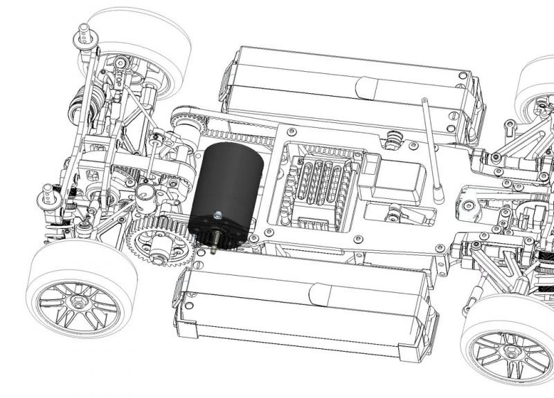 To achieve this, the motor mounting plate is connected to the bearing-block of the spur gear shaft, to the chassis and to the topdeck - Power is then transmitted further with unbreakable, module 1 steel gears.